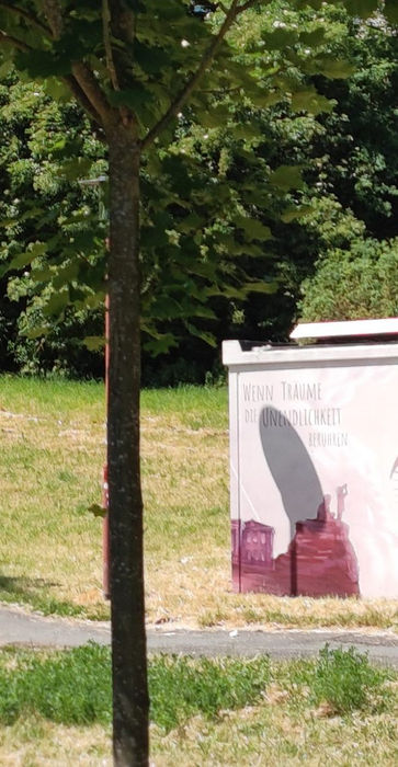 Eine Wiese, ein Trafohaus, ein Blick ins All.